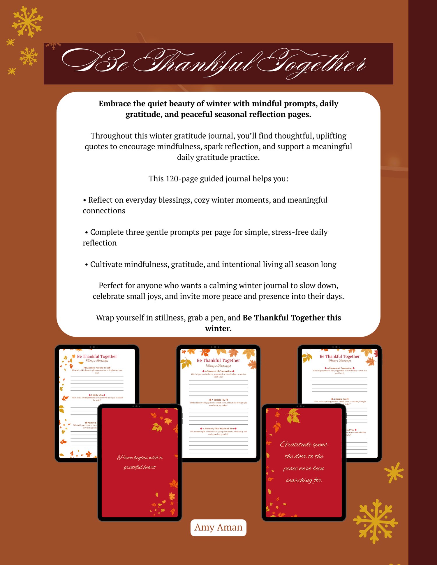 Bring warmth, peace, and intentional reflection into the winter season with the Be Thankful Together: Winter Gratitude Journal—a beautifully designed printable guided journal created to help you slow down, appreciate simple joys, and deepen your daily mindfulness practice.