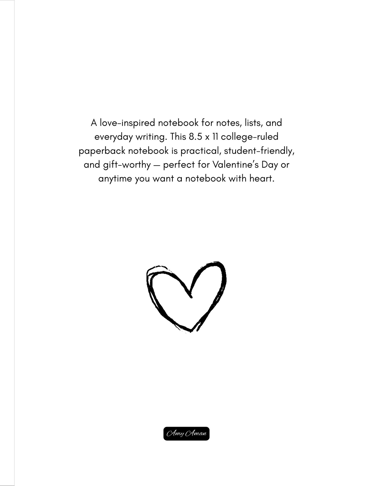 Love Notes is a college-ruled notebook designed for everyday writing, note-taking, and organization. Featuring a clean, student-friendly interior, it’s perfect for school, work, or personal use. With a beautifully designed cover, this 8.5 x 11 notebook is ideal as a Valentine’s Day gift or as a timeless love-inspired notebook for year-round use.