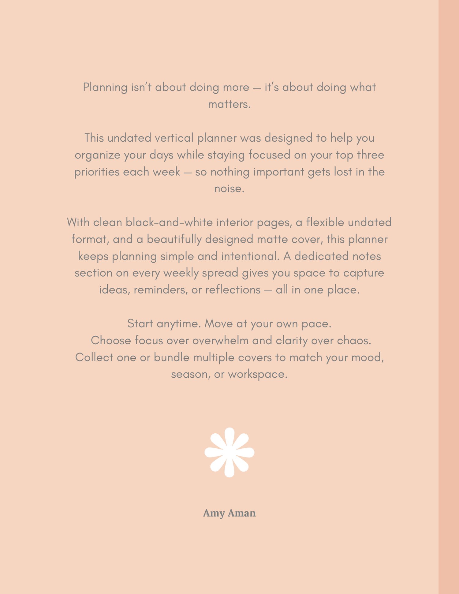 This undated vertical 1-year planner is designed to help you stay organized, focused, and consistent — without rigid dates, overwhelming layouts, or unnecessary clutter.